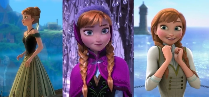 - Anna é a segunda Disney Princesa que mudou a cor do cabelo, junto com Rapunzel. Curiosamente, ambas mudaram a cor de seus cabelos em momentos de grande tensão, ou preocupação, para não só um como vários personagens do filme.