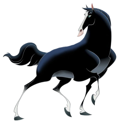 | Aparência | Cavalo preto, focinho branco, pernas brancas, grande, barriga cinza, olhos verdes |
