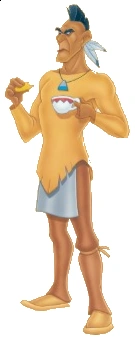 | Aparência | Pele parda, cabelos pretos, olhos castanhos, forte, colar azul, roupa de índio laranja, calças marrons, sapatos de madeira |