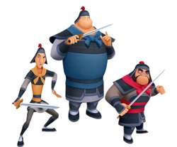 De acordo com o comentário do DVD de Mulan, estes três representam essencialmente todo o exército chinês. Eles provavelmente foram recrutados através de aviso, semelhança á Mulan. Como soldados do Exército chinês, eles são capazes de lutar usando vários métodos, incluindo espadas, canhões, flechas, e combate corpo a corpo.